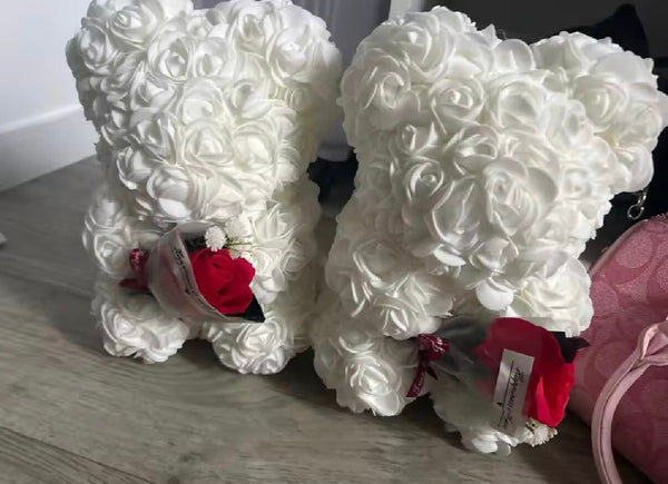 The foam roses on the bear maintain their beauty indefinitely, unlike fresh flowers. The included fresh rose lasts about a week with proper care.